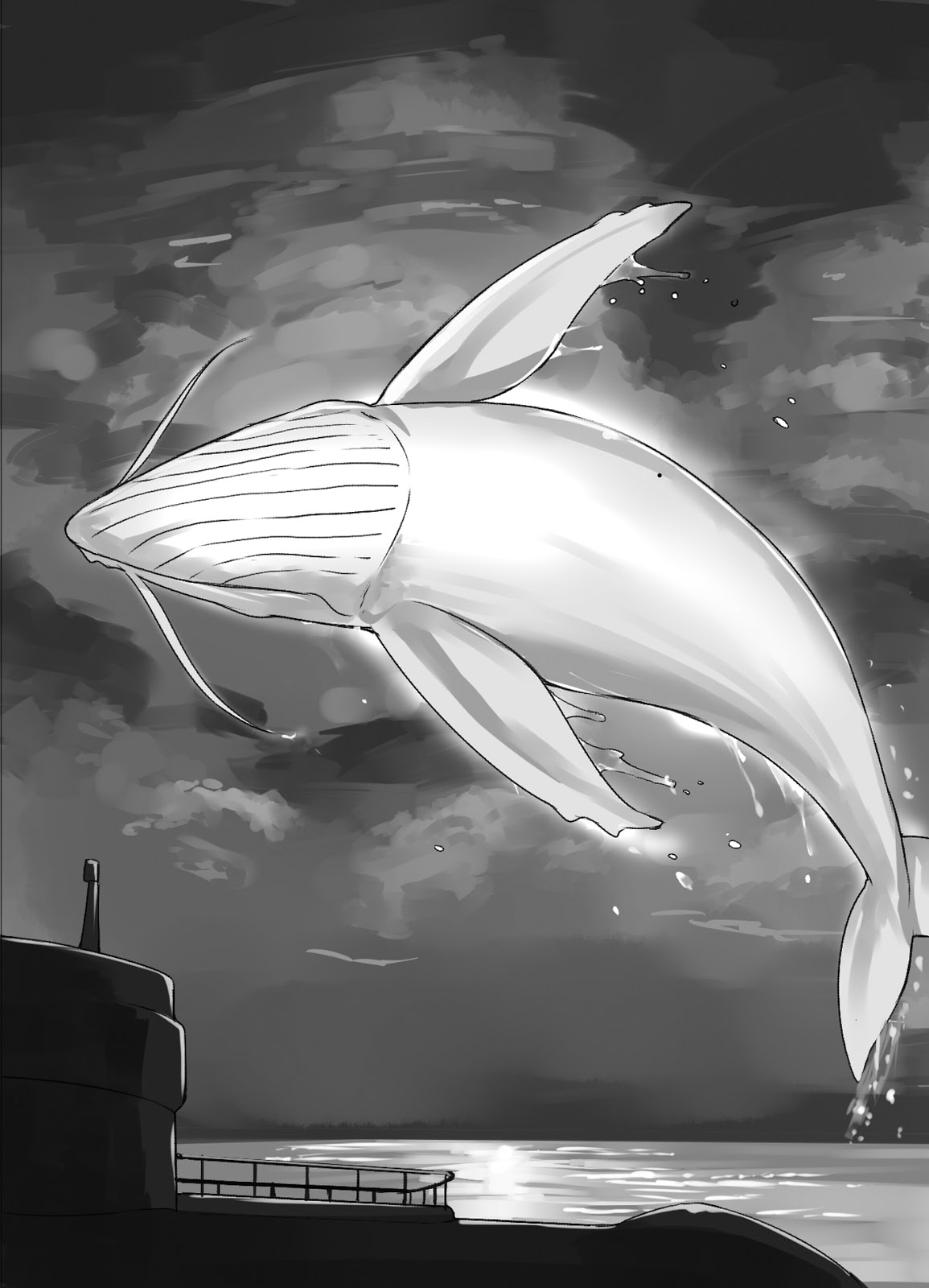 Pada bagiannya, paus menjadi lebih cerah dan lebih cerah sampai seluruh dunia tertutup cahaya. Itu melesat ke langit seperti kembang api dan menghalau awan gelap yang menutupi kota dengan sinarnya yang menyilaukan.