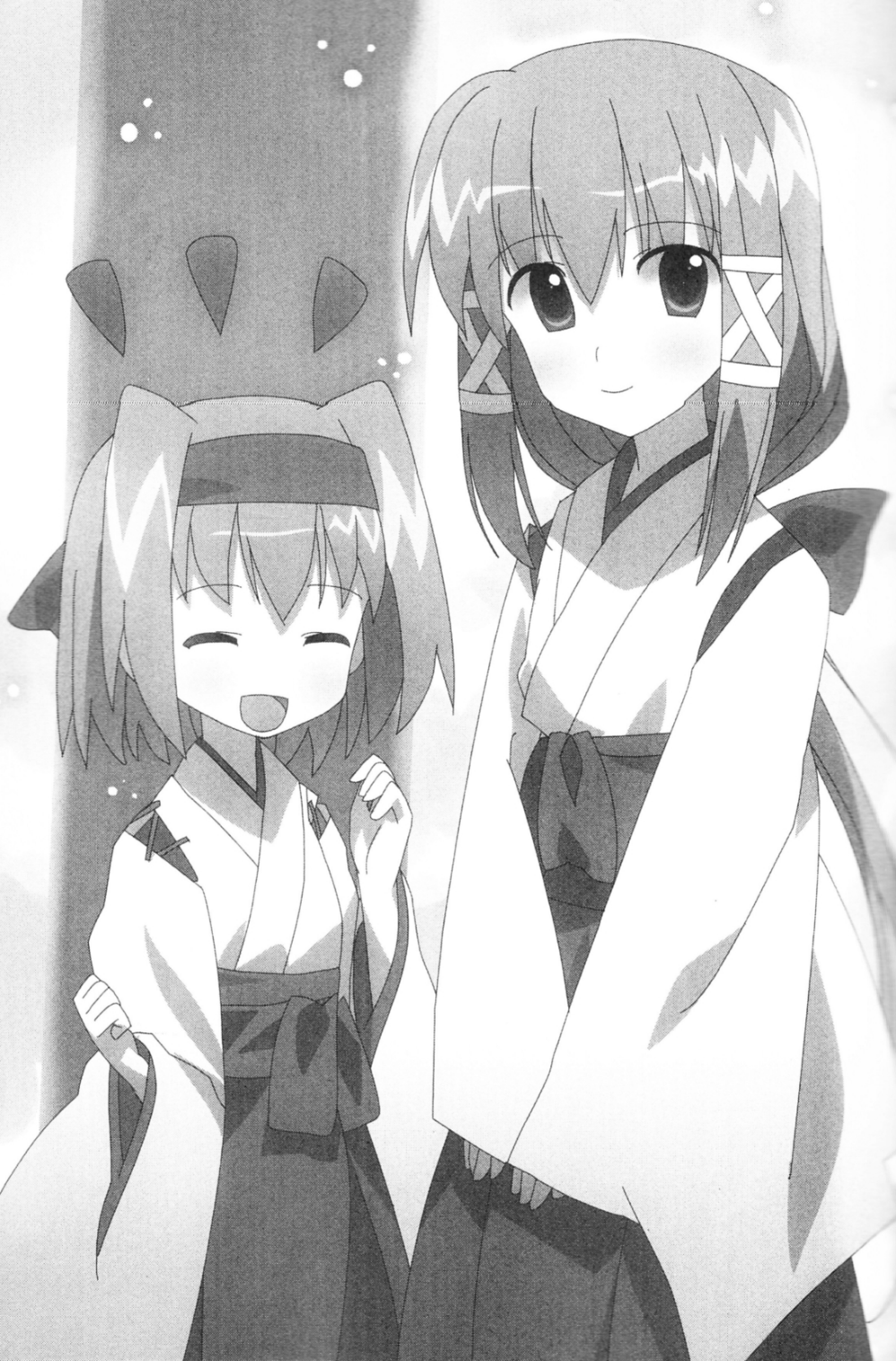 Hikari dan Yuri. Kuil Shinto selalu memiliki “masa sibuk” sebelum dan sesudah akhir tahun. Sebagai Hime-Miko, kedua gadis itu telah bekerja selama beberapa hari terakhir secara berurutan. Godou menyapa para suster yang berpakaian miko.