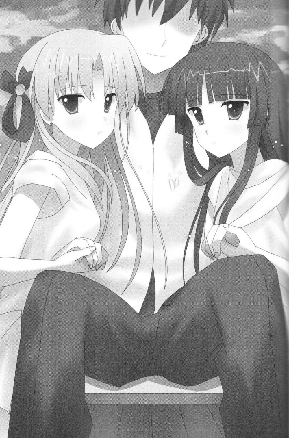 Terjepit di antara dua gadis, satu di kanan dan yang lain di depan, Godou bisa merasakan melalui kulitnya kedua kelembutan dan berat badan yang sama. Di saat yang sama, dia berciuman dengan Ena.