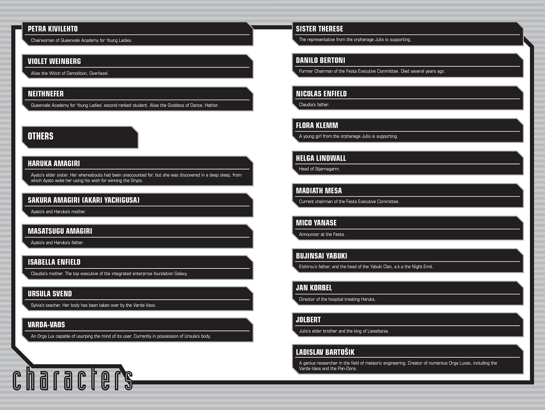 aku ingin menyampaikan terima kasih yang sebesar-besarnya kepada O, editor baru aku, bersama dengan editor aku sebelumnya dan S untuk semua pekerjaan mereka mengatur anime dan menangani hak-hak. aku juga ingin mengucapkan terima kasih kepada semua orang di departemen editorial, semua orang yang terlibat dalam anime, semua orang yang bekerja pada adaptasi video game, dan semua orang yang telah mendukung aku selama ini.