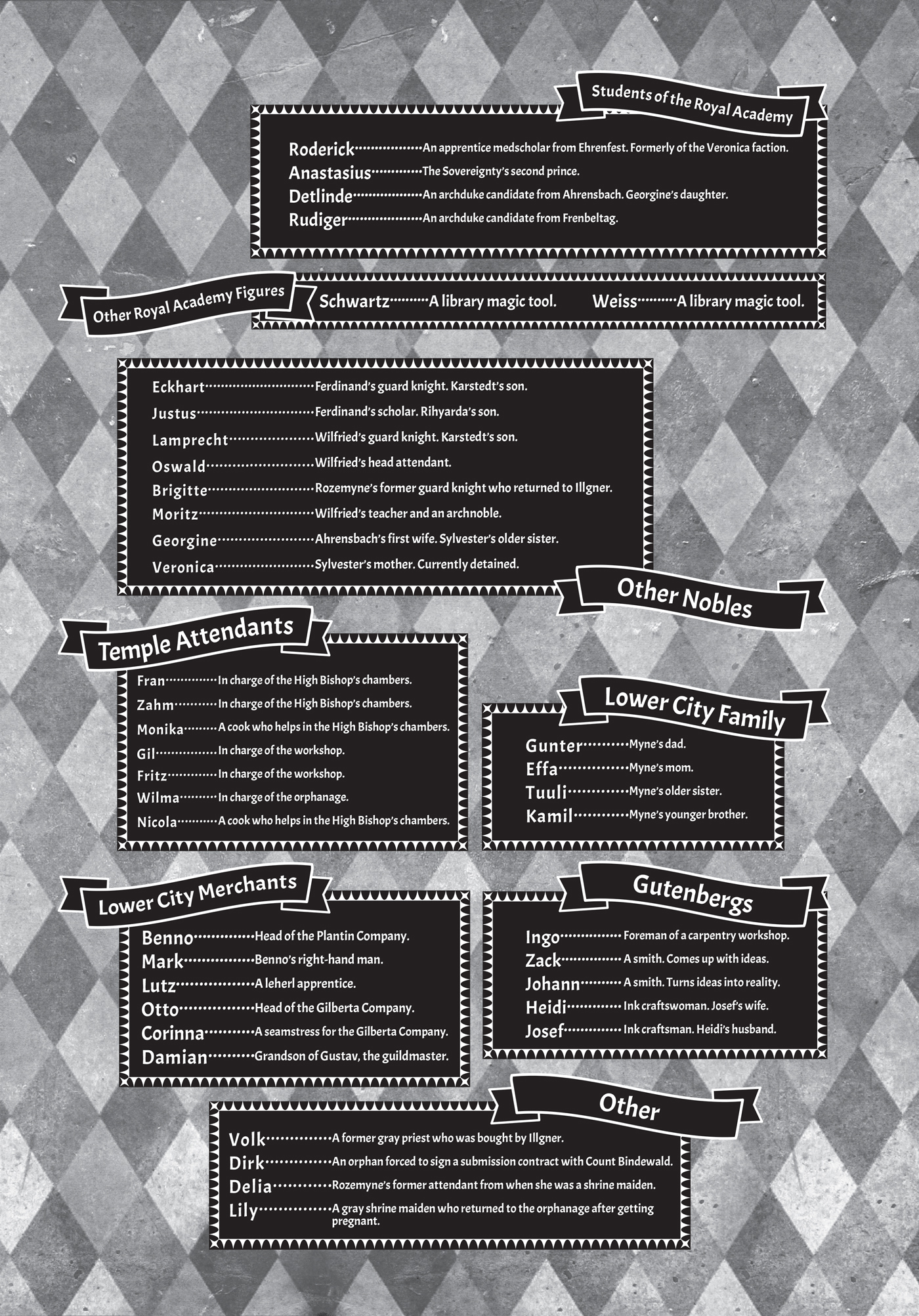 Kaum awam rupanya mengidolakan Rozemyne, dan usahanya sering dilontarkan oleh Damuel, Wilfried, dan Charlotte. Tampaknya Rozemyne mengenali nama itu, karena ekspresi khawatirnya langsung berubah menjadi senyum tipis.