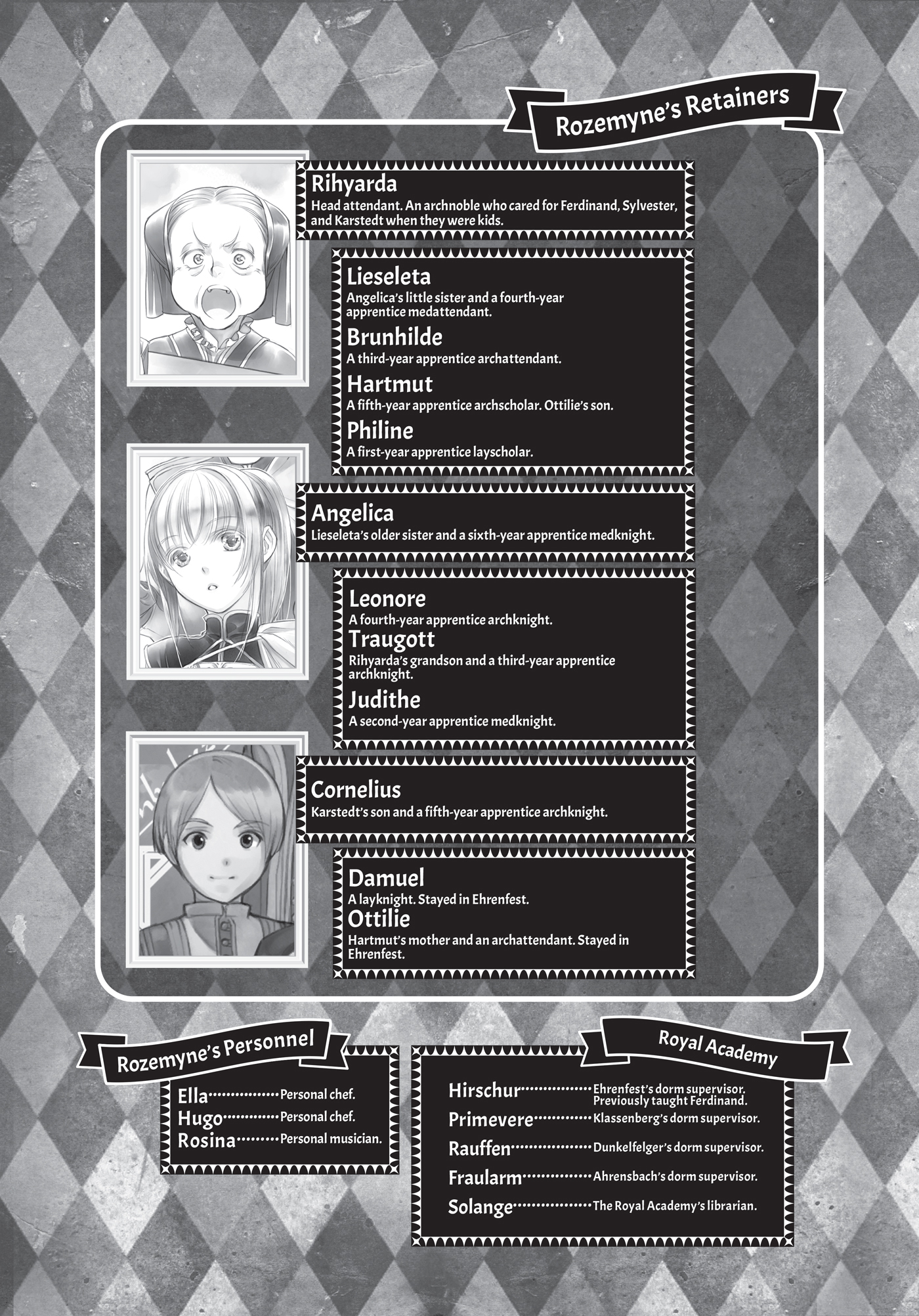 Ferdinand telah dipanggil ke kastil lebih sering, di mana dia akan menerima tuntutan yang tidak masuk akal dari Sylvester dan Bonifatius. Yang terakhir khususnya terus-menerus menuntut agar dia melakukan beberapa skema atau lainnya untuk menangkap Viscount Gerlach, dan bahwa dia melakukan sesuatu untuk membangunkan Rozemyne sesegera mungkin.
