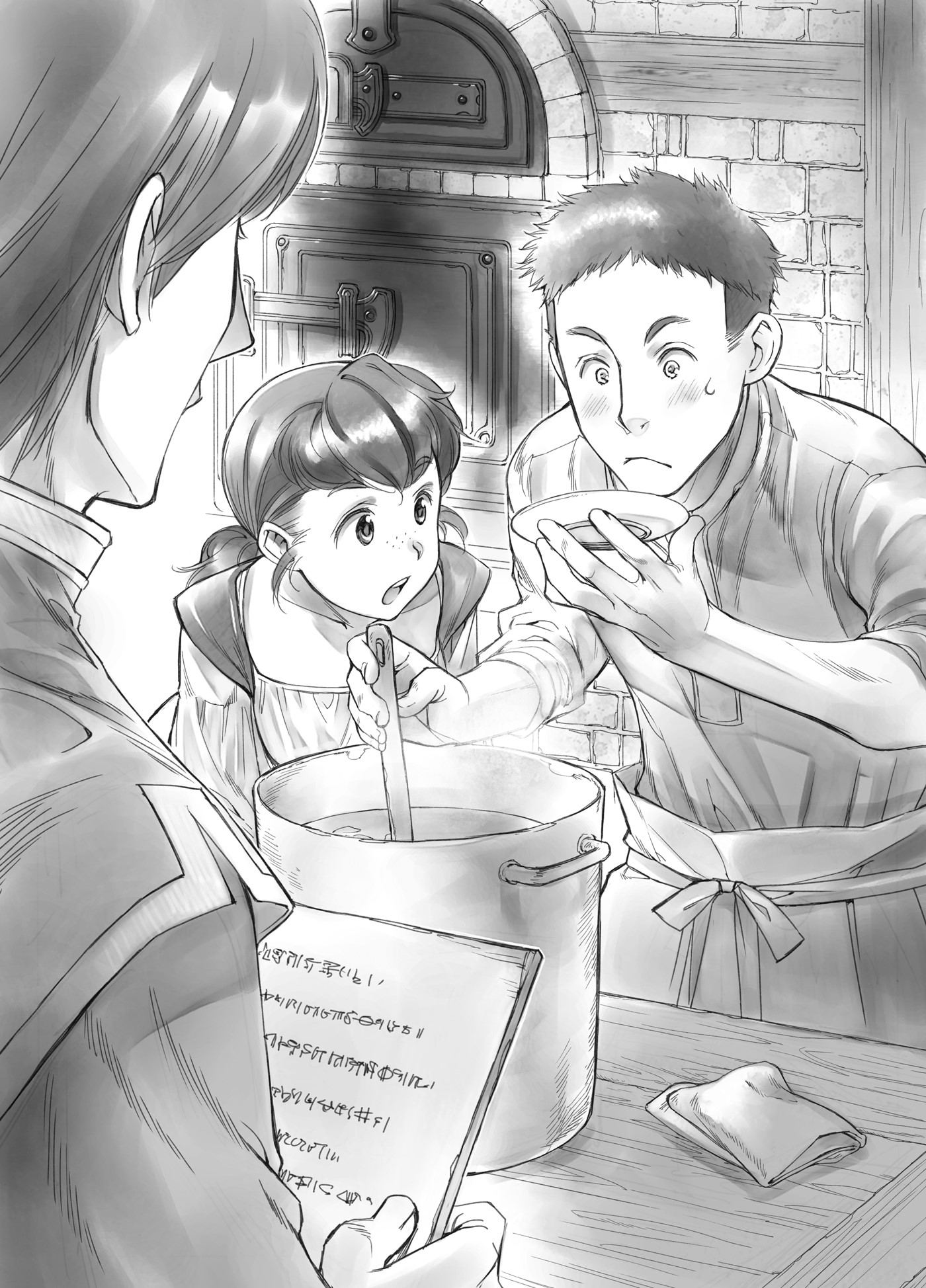 Aku memberi tahu Benno bahwa ragi sudah matang, dan dia segera datang ke kamar aku bersama para koki. Dia adalah seorang pemuda berusia sekitar dua puluh tahun, dan telah membawa seorang gadis berusia sekitar sepuluh tahun, yang jelas muridnya. Begitu mereka cukup belajar tentang memasak, koki berikutnya akan datang untuk berlatih.