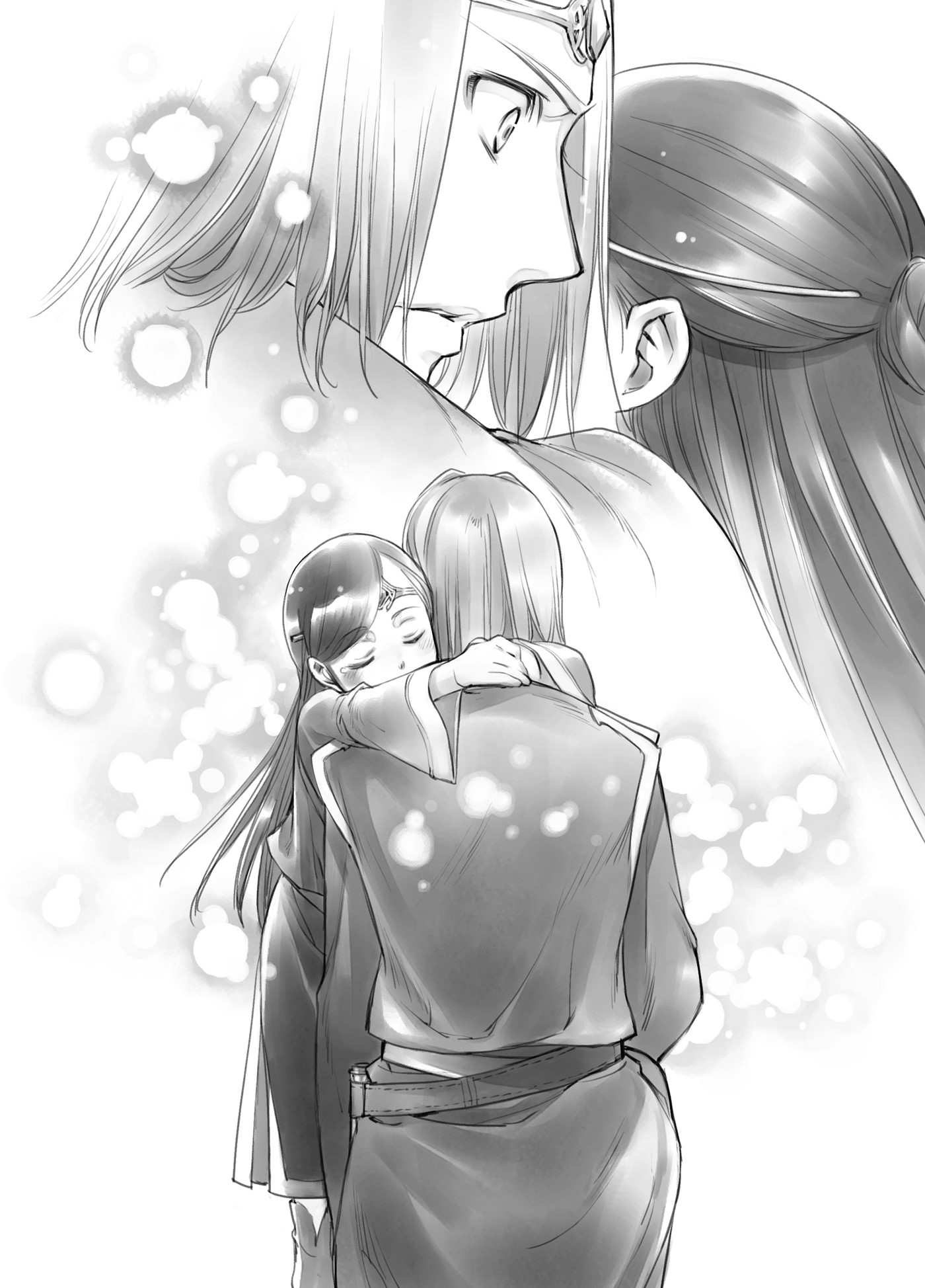 “… Aku tidak pernah merasa lebih buruk.” Dia terlalu banyak bersinkronisasi dengan Myne. Bahkan dia mulai menangis, meskipun emosinya bukan miliknya. Myne akan segera bangun sekarang setelah sinkronisasi berakhir. Ferdinand cepat-cepat menyeka matanya dengan lengan bajunya. Dia bisa melihat air mata menetes dari mata Myne juga, meskipun kenyataannya mereka masih tertutup.