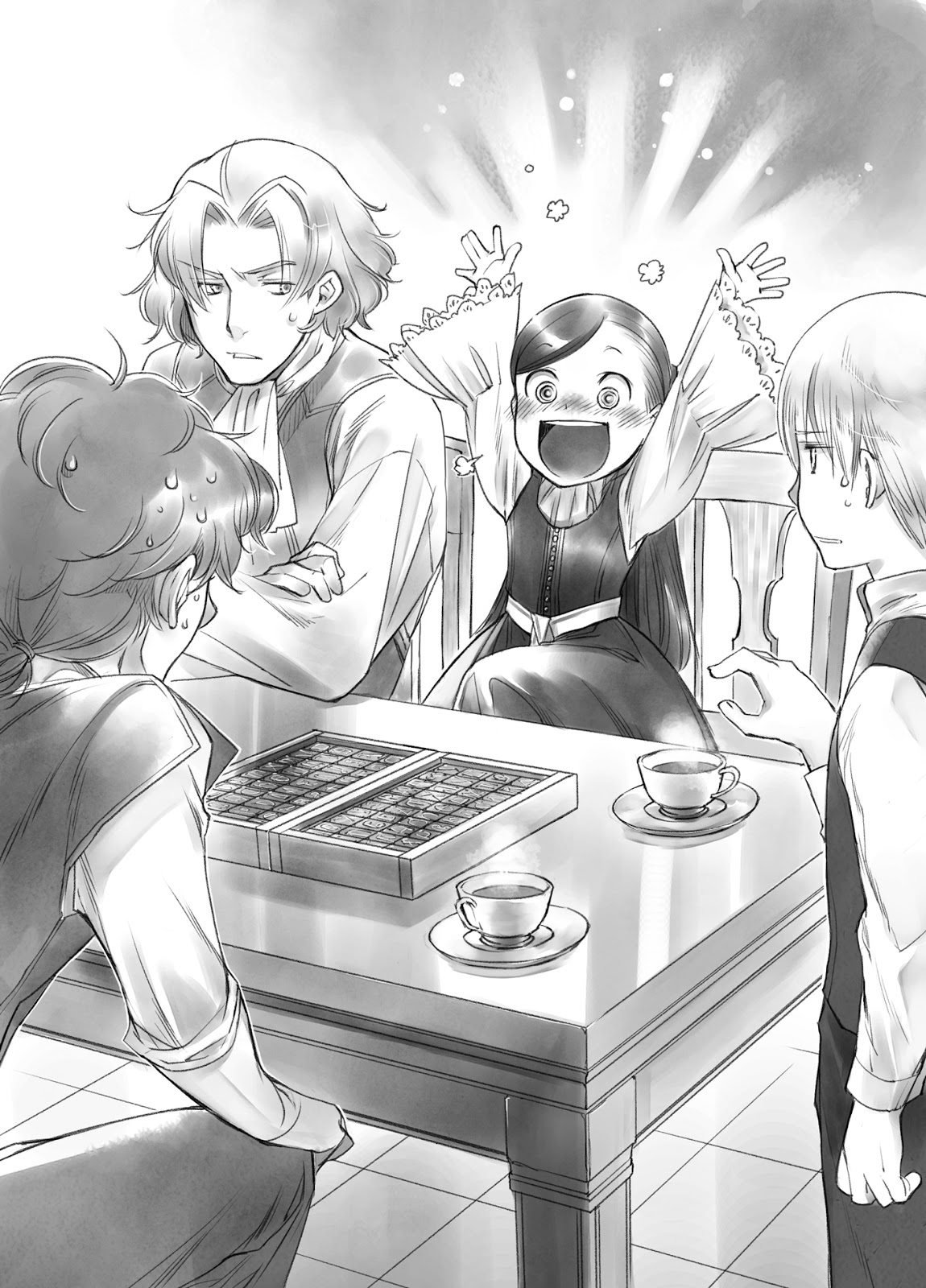 Lutz berusaha menenangkannya, tetapi kegembiraan Myne tak terbendung. Dia segera mengusirnya dan meluncur keluar dari kursinya, berbicara secepat yang dia bisa, pipinya sekarang semakin memerah.