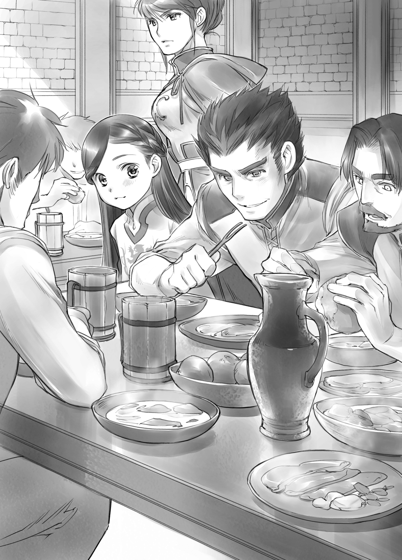 “Ini dia, Lady Rozemyne,” kata Fran, setelah menurunkanku dan menarik kursi. Begitu saya duduk, Eckhart dan Justus duduk di kiri dan kanan saya, sementara Fran dan dua ksatria penjaga berbaris di belakang saya.