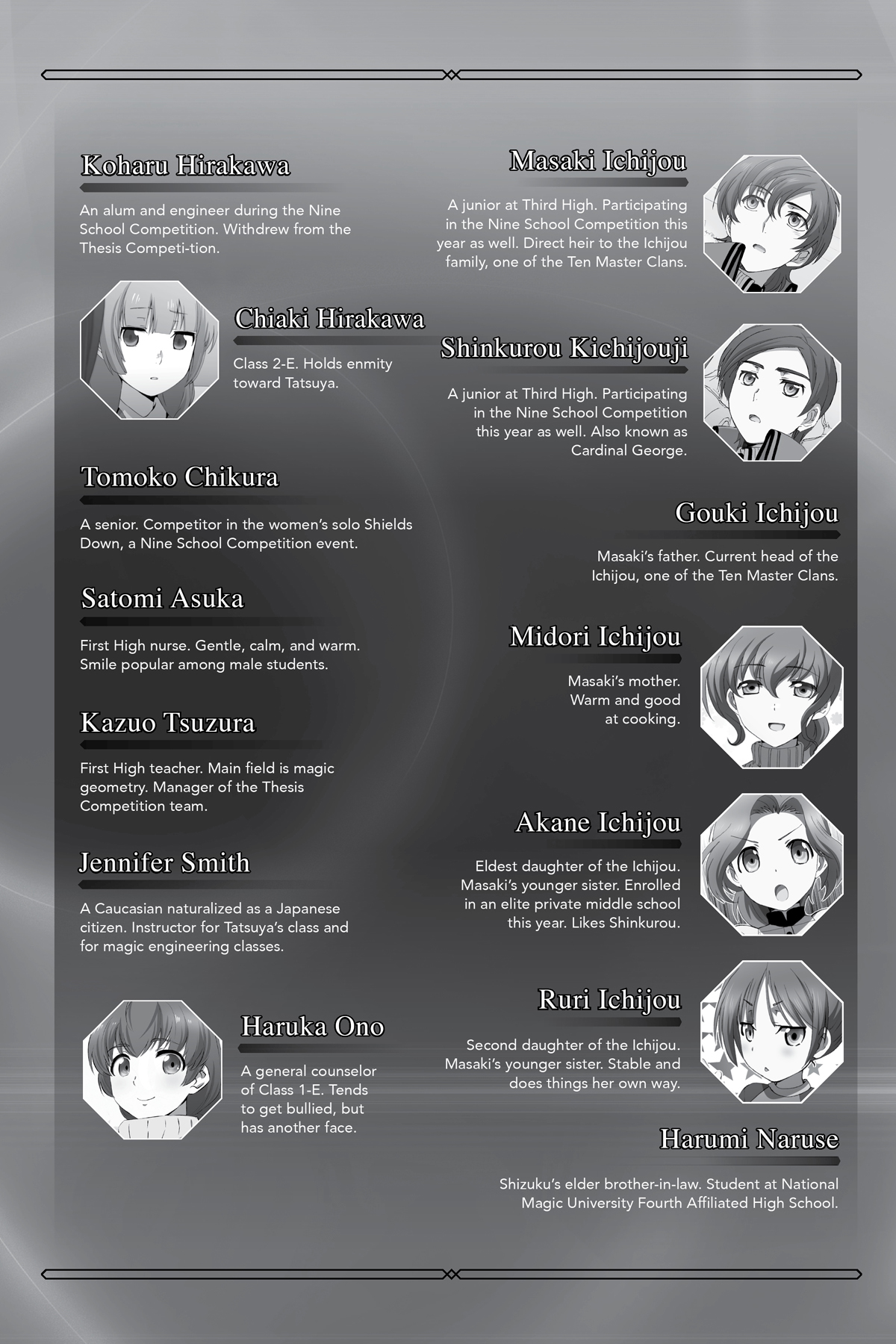 Untuk sekolah menengah sihir yang menaruh stok besar dalam keterampilan praktis, Kompetisi Sembilan Sekolah — Turnamen Kompetisi Sihir Niat Baik Sekolah Menengah Sihir Nasional — adalah acara yang sangat penting. Tidak hanya untuk sekolah itu sendiri tetapi juga untuk siswanya. Lagipula, tak jarang prestasi mereka di kompetisi tersebut memengaruhi jalur kariernya secara langsung. Mungkin tidak terhindarkan beberapa siswa akan mencurahkan lebih banyak upaya mereka untuk kompetisi daripada ujian berkala mereka.