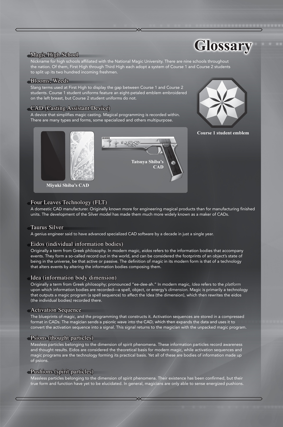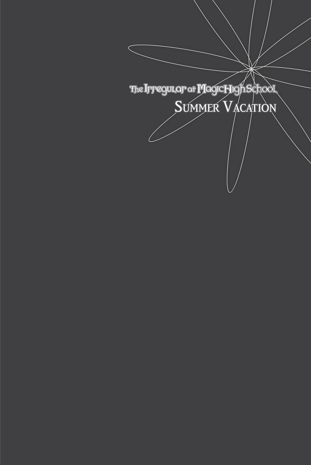 Liburan musim panas untuk sekolah menengah sihir berlangsung hingga akhir Agustus. (Banyak sekolah menengah sains dan sastra mengakhiri liburan musim panas mereka pada pertengahan Agustus, sementara liburan sekolah seni dan pendidikan jasmani sering kali berlangsung hingga pertengahan September.) Tahun lalu dan tahun sebelumnya, sebagian besar liburan musim panas Tatsuya telah diambil. dengan berlatih bersama Batalyon Sihir Independen dan berbagai penelitian. (Musim panas lalu juga penuh dengan persiapan ujian — terutama sebagai tutor rumah Miyuki.) Karena Kompetisi Sembilan Sekolah telah berlangsung selama paruh pertama tahun ini, jadwalnya saat ini sangat ketat. Pengembangan perangkat khusus sihir penerbangan, yang akan hadir bulan depan, hanya memperburuk keadaan.Baginya, liburan musim panas, sekali lagi, bukanlah liburan sama sekali.