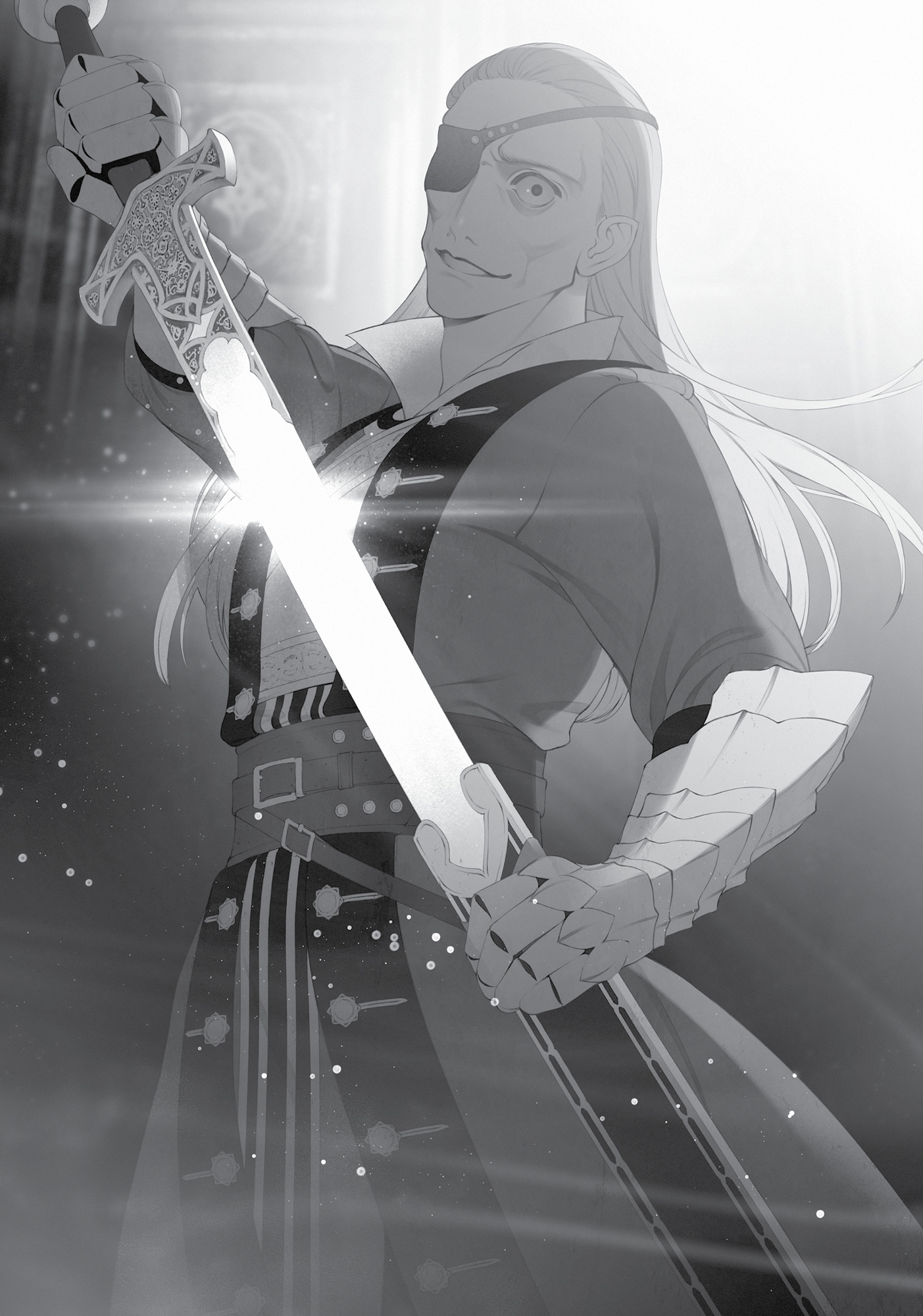Randolph menghunus pedangnya, menerangi lorong dengan cahaya kehijauan. Zanoba mengambil tongkatnya sebagai tanggapan; Roxy juga mengangkat tongkatnya.