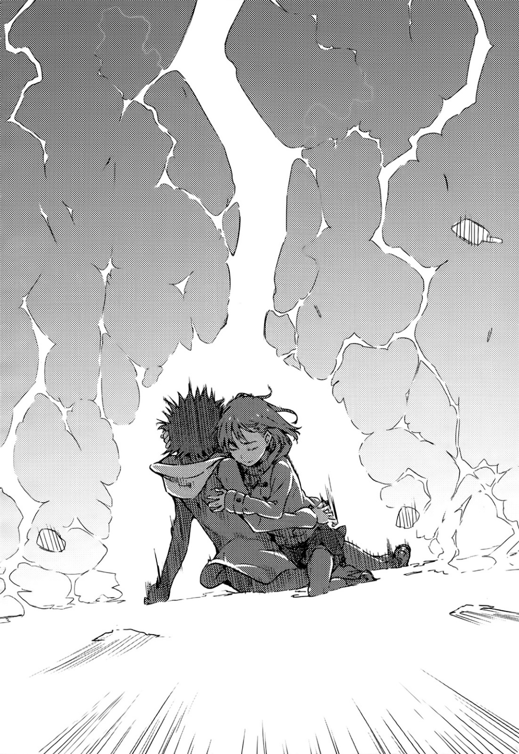 Suara ledakan meledak ketika tinju Misaka Mikoto menghantam Kamijou Touma dari jarak dekat.