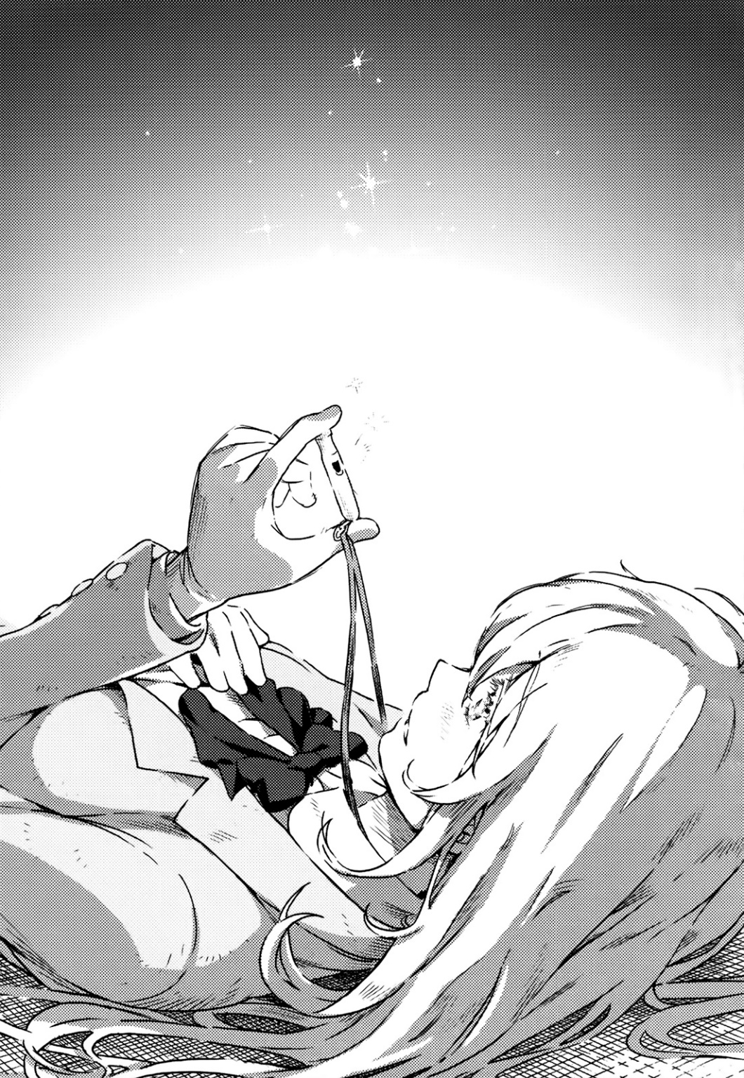 Shokuhou Misaki mengeluarkan pita tipis. Dia melewatinya melalui pengikat peluit darurat, membentuk lingkaran besar, dan mengenakannya sebagai kalung. Dia kemudian mendorongnya ke dalam peti seragamnya sebagai harta terpendam.