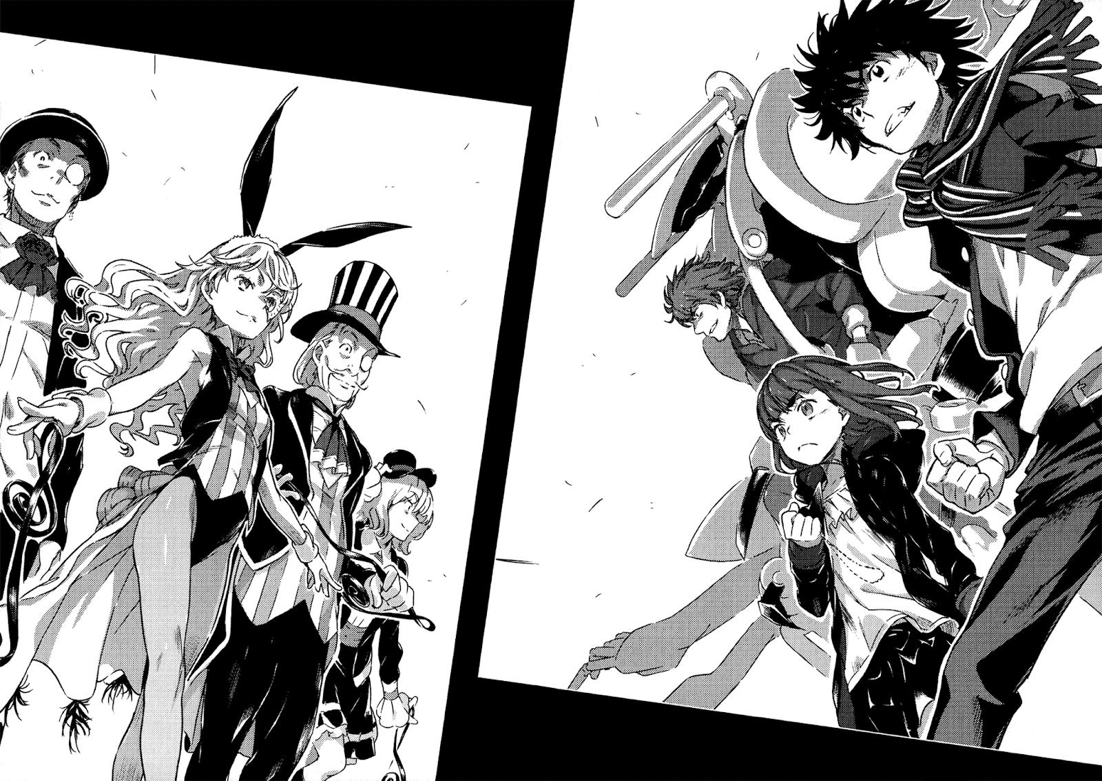 Kamijou dan Hamazura memotong dan menggunakan Imagine Breaker dan lengan Power Lifter untuk menerobos hujan tombak. Kamijou meraih Kanou Shinka melalui celah kecil, menariknya, dan kemudian mendorongnya ke depan.