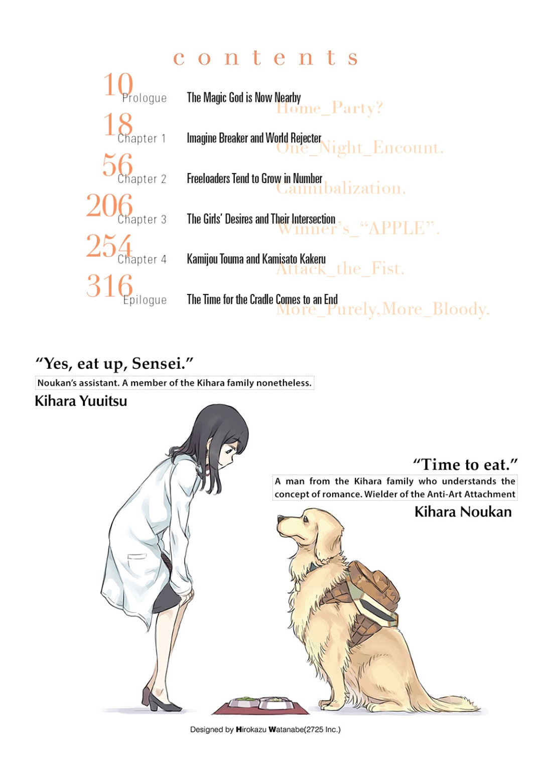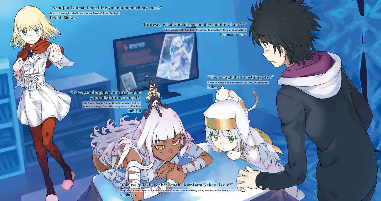 Di dalam ruangan yang dingin itu, dua sosok memukul pose menakutkan di depan bocah itu. Salah satunya adalah Index, biarawati berambut perak mengenakan kebiasaan putih seperti cangkir teh dengan jahitan emas, dan yang lainnya adalah Othinus, Dewa Sihir lima belas sentimeter.