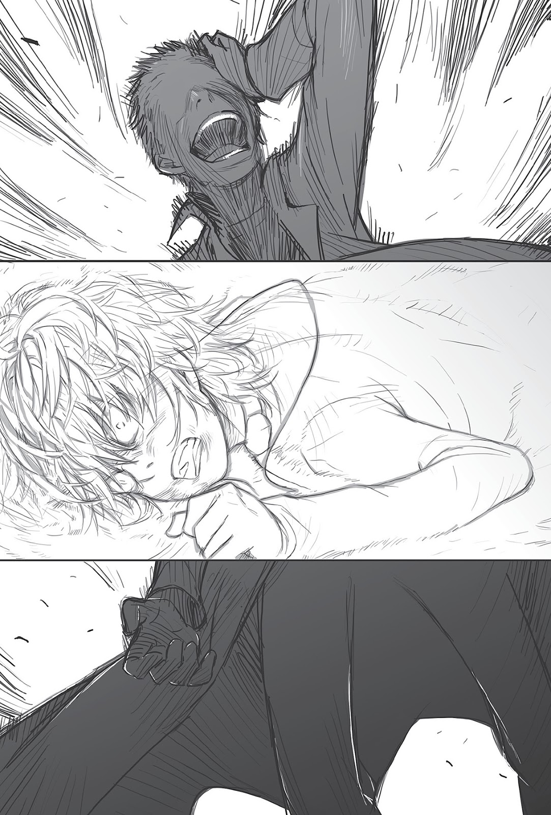 Sambil mengguncang rantai, yang berlumuran darah, dia mengangkat suaranya. “Ha-ha, kau benar-benar menyebalkan !! Menggantung lengan kanan mu yang menjijikkan itu, melindungi ‘malaikat’ yang layak muntah itu … Seberapa besar kau ingin membuatku tertawa sebelum kau puas ?! ”