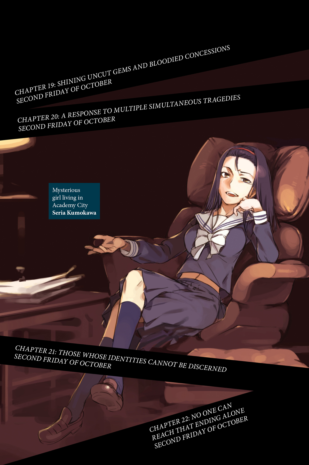 Station wagon melaju melalui Academy City, pusat kota yang dibangun di atas tanah kosong di bagian barat Tokyo. Di dalam kendaraan itu ada tiga pemuda: Ritoku Komaba, Shiage Hamazura, dan seorang pria yang hanya dikenal sebagai Hanzou. Mereka termasuk dalam kelompok berandalan bernama Skill-Out.