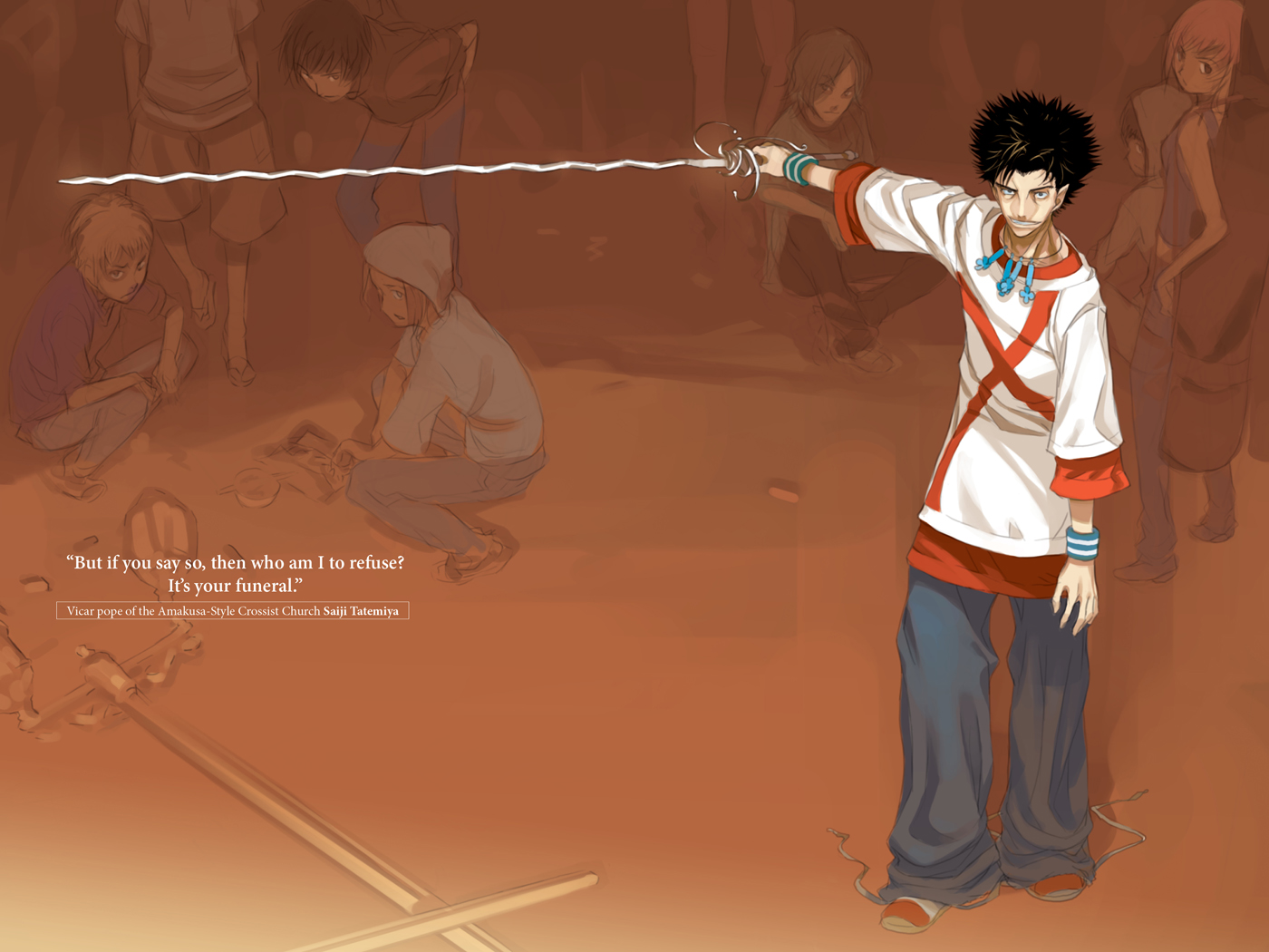 “Sebagai sebuah gereja, Amakusa-Style secara signifikan lebih kecil daripada agama-agama nasional Roma, Inggris, dan Rusia. Bahwa mereka terus berkembang di dunia adalah karena kehadiran yang tidak teratur: Kanzaki. Pilar utama mereka telah hilang, jadi tidak aneh jika mereka mencari Kitab Hukum dan menggantikannya dengan itu. Lagipula, menggunakan buku itu bisa sangat mengganggu keseimbangan kekuatan Crossism. ”