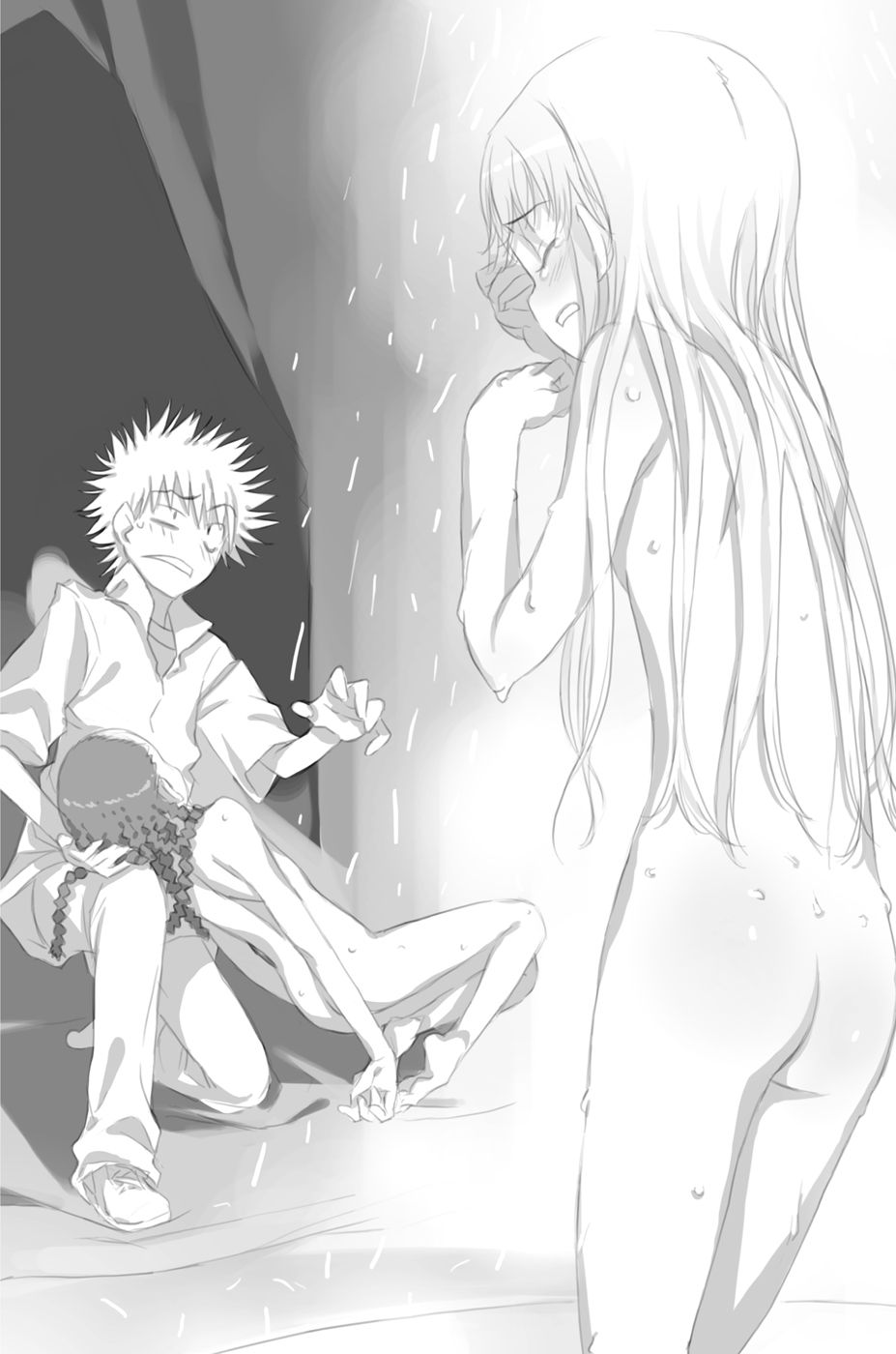 Touma Kamijou mengambil serangan peluru es ajaib dan jatuh ke tanah.