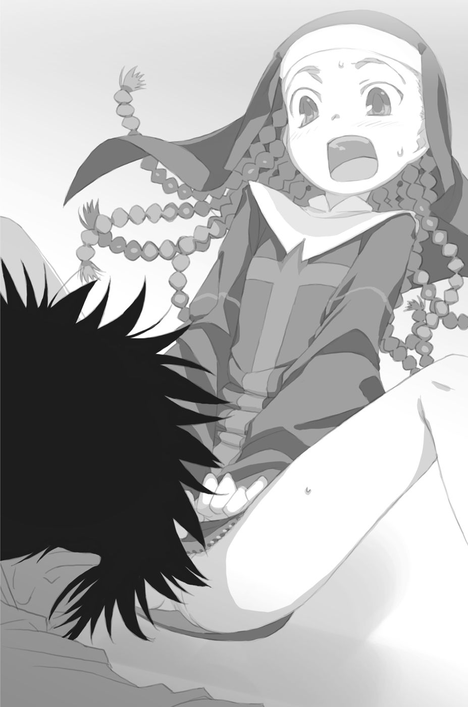 Tapi itu tidak datang diam-diam. Agnes, dalam kebiasaan biarawati hitamnya, sibuk berteriak kepada saudara perempuan berpakaian lain yang sama dalam bahasa lain, memberikan perintah dan menunjuk ke segala arah. Dia juga menulis sesuatu dalam sebuah buku kecil dengan pena bulu dengan kecepatan luar biasa. Index mengatakan kepada Kamijou itu seperti panggilan telepon: Ketika dia menulis di buku itu, surat-surat itu tampaknya akan muncul di buku di tempat lain. Dia berpikir secara pribadi bahwa itu lebih seperti pesan teks daripada panggilan telepon.