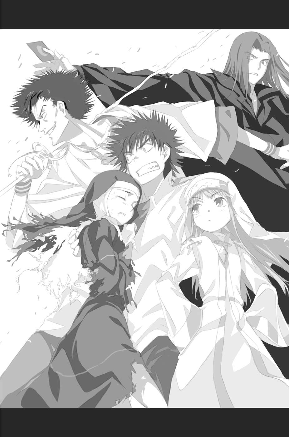 Otot-otot pipinya bergetar aneh dan dia mulai bergumam sendiri. Para saudara perempuan berpakaian hitam, yang berdiri diam sampai sekarang, semua berbalik menghadap Touma Kamijou. Ratusan senjata yang mereka pegang membuat suara mekanis yang menakutkan, seperti tentara berbaris maju.