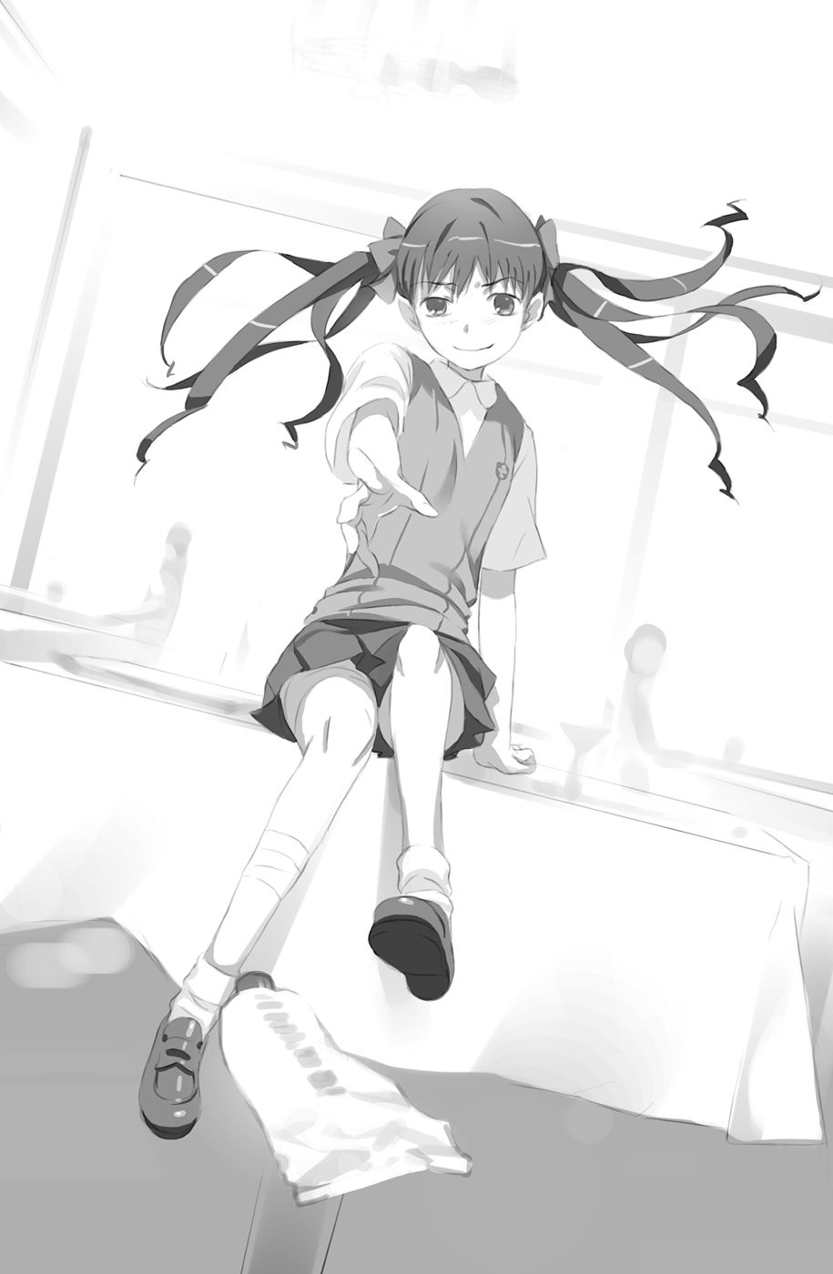 Ketika Mikoto Misaka mencarinya, Awaki Musujime berdiri di samping jendela dengan koper putih bergulir di sebelahnya, dan menatap gadis lain dari atas.